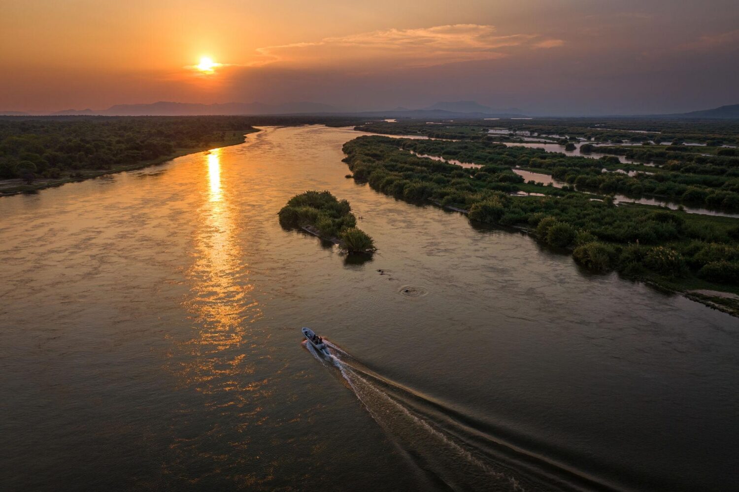 The river safari offers close encounters with hippos clustered in calm channels and crocodiles basking along sandy banks. Elephants often approach the shoreline to drink as the sun lowers across the water. The wide river, dotted with small islands, reflects warm golden light that defines the Zambezi at dusk.