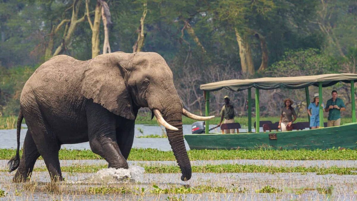 An early morning drive takes advantage of cool temperatures when wildlife movement is highest. Elephants often emerge from woodland to feed along marsh edges. Waterbuck and bushbuck linger in shaded areas, while large flocks of waterbirds gather in shallow sections.
