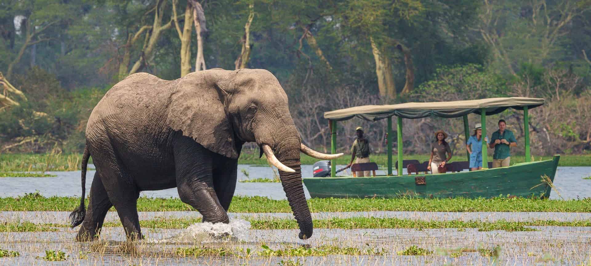 An early morning drive takes advantage of cool temperatures when wildlife movement is highest. Elephants often emerge from woodland to feed along marsh edges. Waterbuck and bushbuck linger in shaded areas, while large flocks of waterbirds gather in shallow sections.